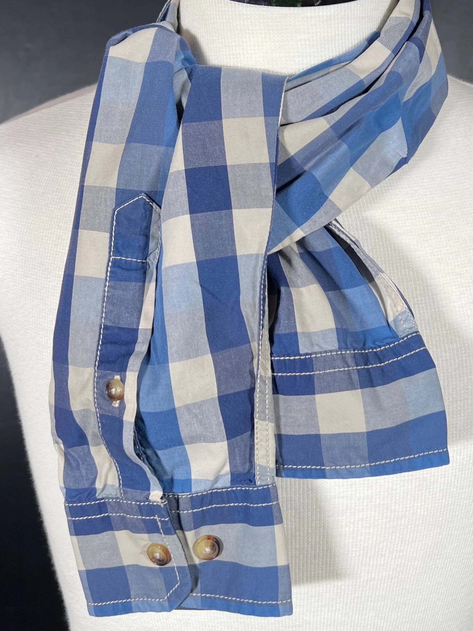 Dieser Ärmelschal wird aus zwei originalen Hemdsärmel gefertigt und in unserem Berliner Atelier neu gestaltet. Knopfleiste, Manschette und Steppnähte bleiben bewusst sichtbar – jedes Detail erzählt seine Geschichte.